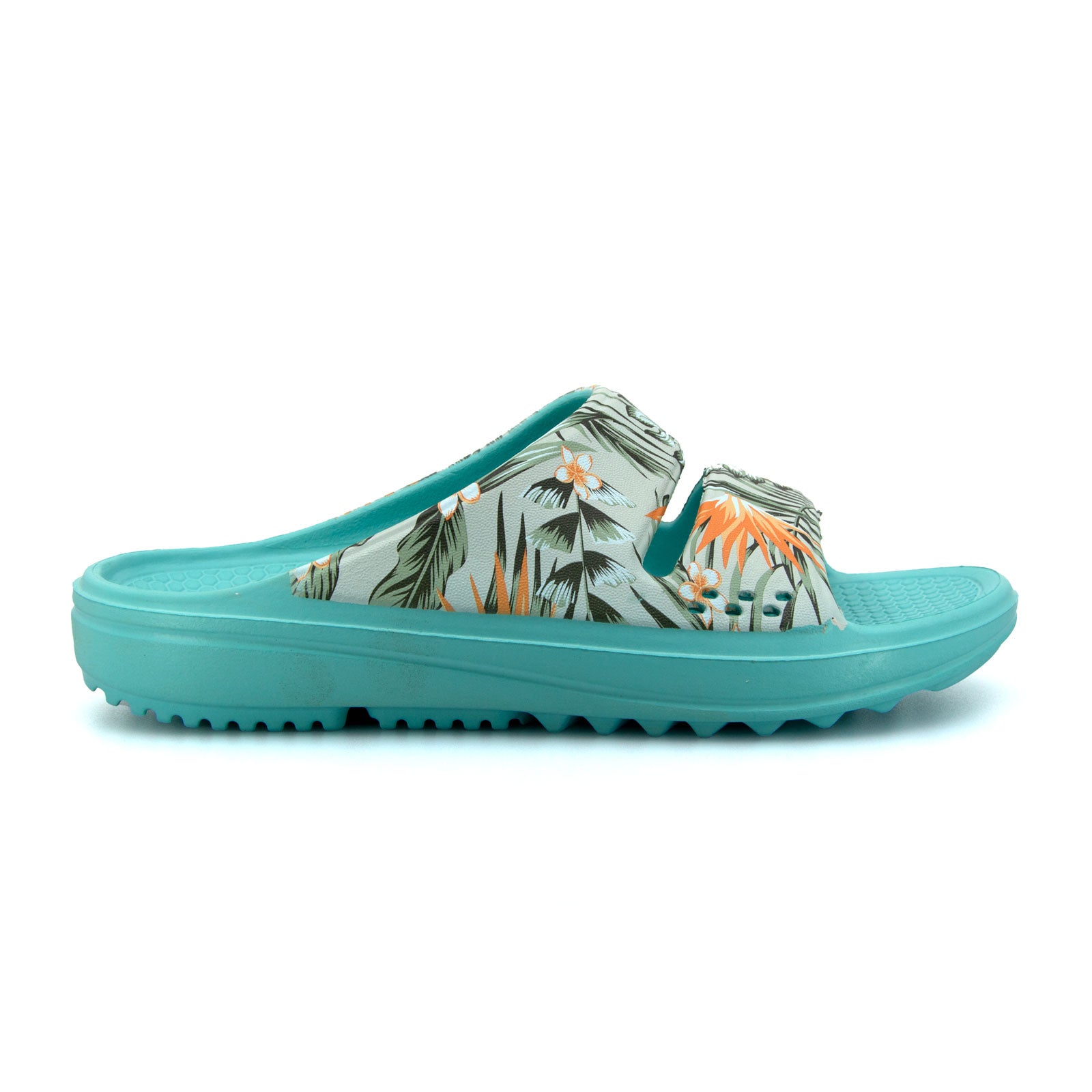 Crafted with 100% waterproof EVA, the Women's Island Slides in Aqua Palm provide reliable protection in wet conditions. The contoured arch support footbed delivers comfort and stability for extended wear. Snug upper straps ensure a secure fit, though those with a high instep may prefer sizing up for added comfort. Designed with Clogees’ signature focus on lightness, flexibility, and softness, these slides are an expert choice for both casual and active use.
