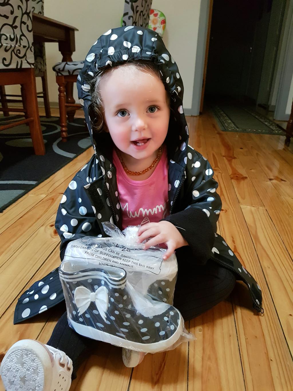 This Rainy Day coat is simply stylish. This metallic spotted, black, fully polar fleeced lined coat, will keep your child warm and dry this winter. This fully waterproof raincoat has an internal zip and the added advantage of velcro tabs to secure for those children not able to yet manage their zip themselves. No more poppers to fuss about. Just press and seal in dryness.